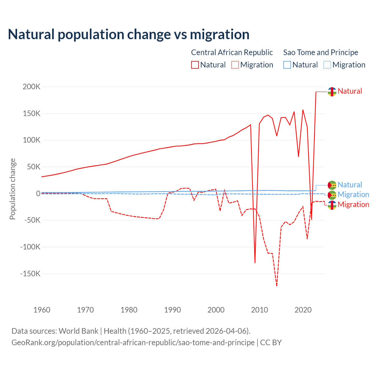 Over the last 10 years, 66.7% of the population change in the Central African Republic is from natural causes (a gain of 1,164,312 people) and 33.3% is from migration (a loss of 580,593 people). In Sao Tome and Principe 80.1% is from natural causes (a gain of 50,822 people) and 19.9% is from migration (a loss of 12,621 people).