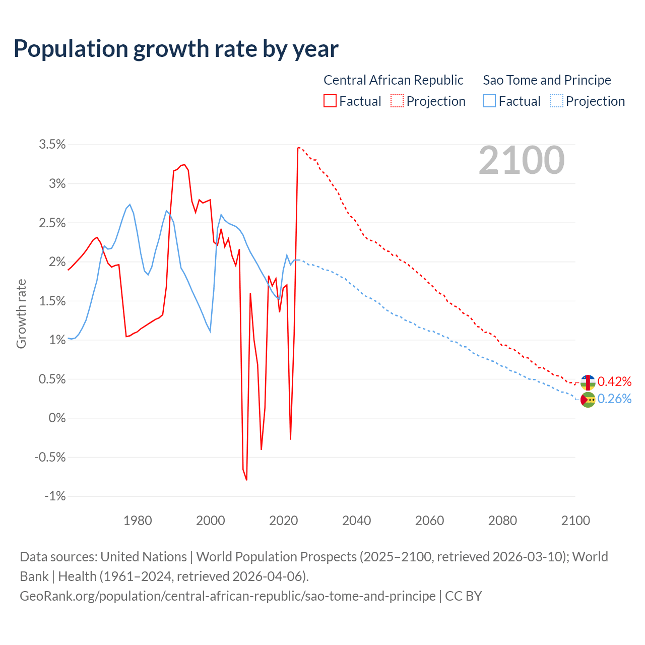 - For the last 10 years, the Central African Republic has had an average growth rate of +1.27% per year vs +1.82% in Sao Tome and Principe.