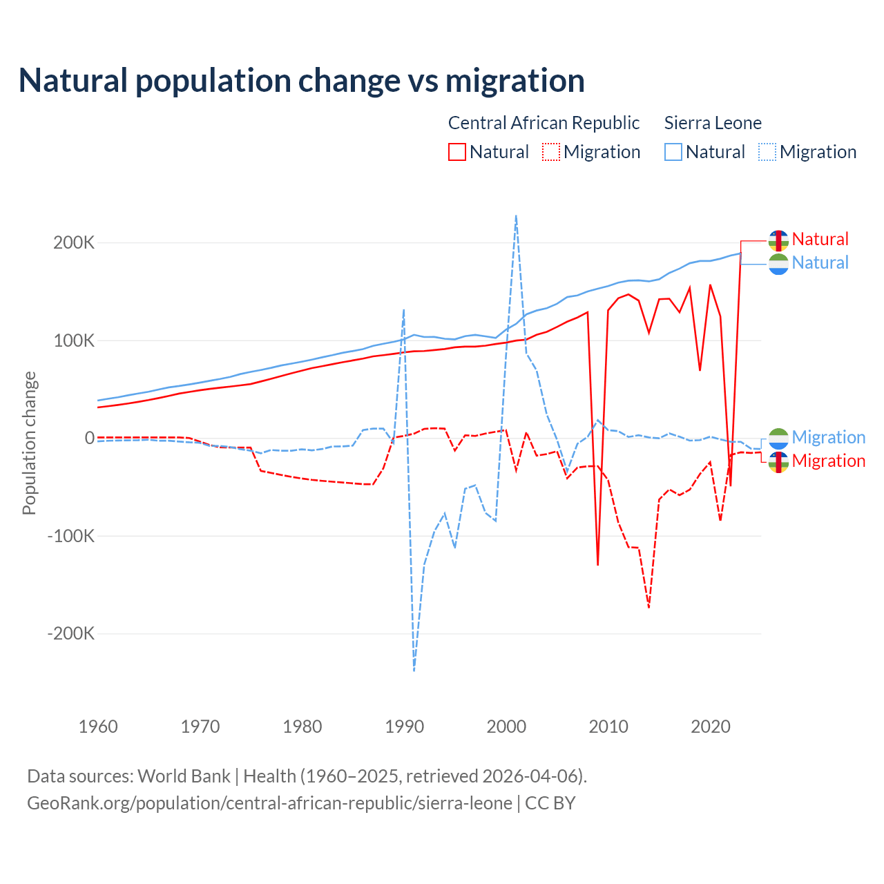 Over the last 10 years, 66.7% of the population change in the Central African Republic is from natural causes (a gain of 1,164,312 people) and 33.3% is from migration (a loss of 580,593 people). In Sierra Leone 99.6% is from natural causes (a gain of 1,764,049 people) and 0.41% is from migration (a loss of 7,211 people).