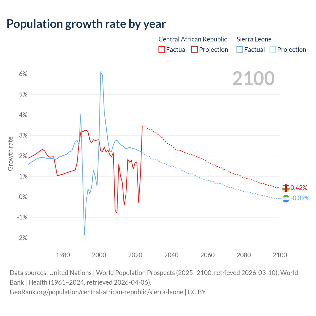 Data sources: World Bank | Health (1960–2024, retrieved 2026-04-06); United Nations | World Population Prospects (1960–2026, retrieved 2026-03-10); U.S. Census Bureau (1960–2025, retrieved 2026-02-08); Central Intelligence Agency (CIA) (2000–2019, retrieved 2026-02-20).
