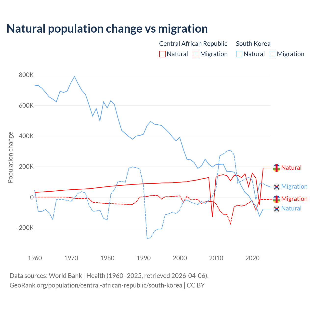 Over the last 10 years, 66.7% of the population change in the Central African Republic is from natural causes (a gain of 1,164,312 people) and 33.3% is from migration (a loss of 580,593 people). In South Korea 17.6% is from natural causes (a gain of 277,215 people) and 82.4% is from migration (a gain of 1,298,356 people).