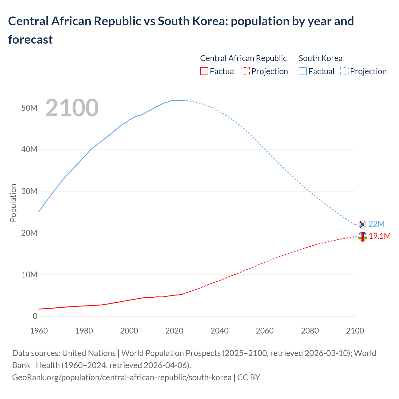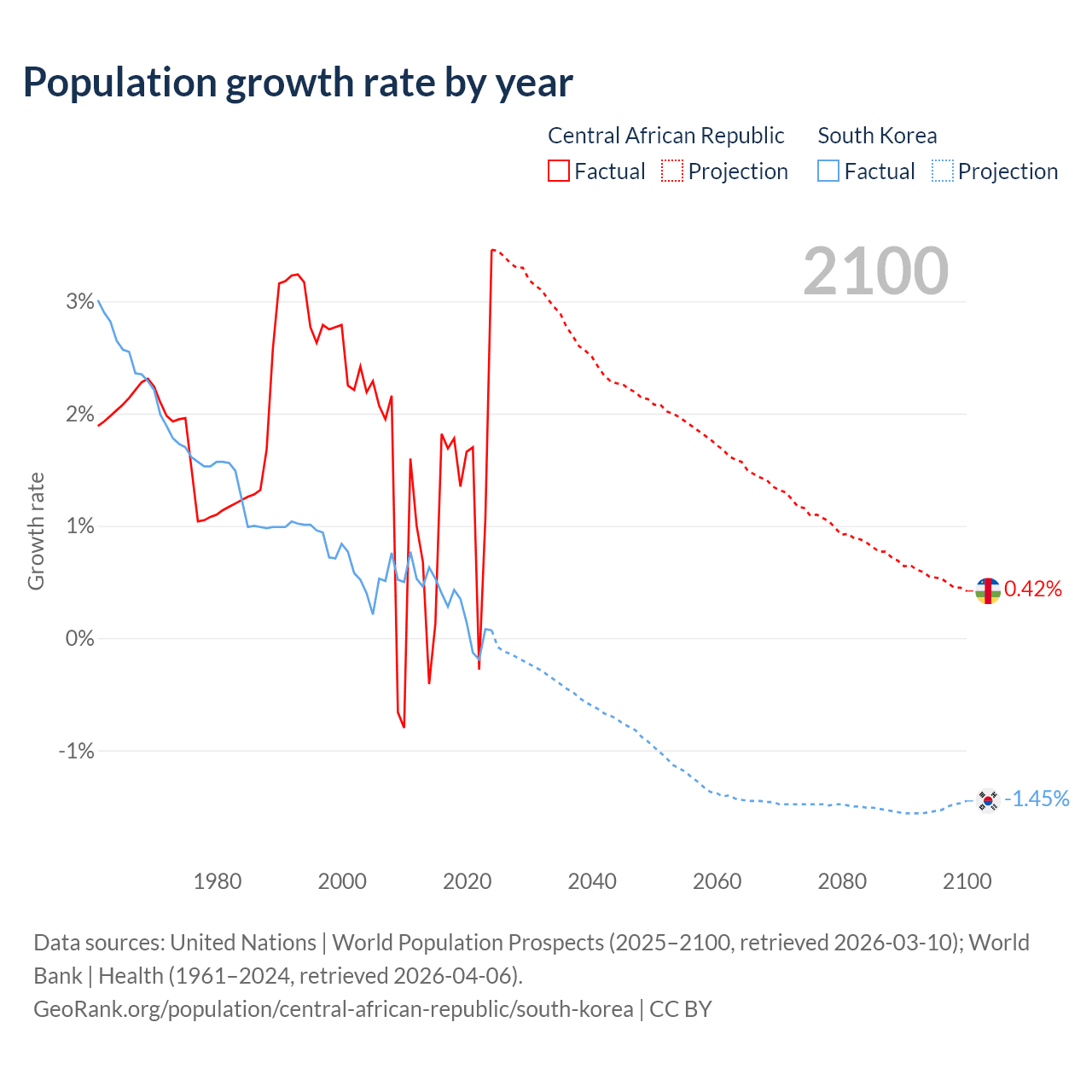 - For the last 10 years, the Central African Republic has had an average growth rate of +1.27% per year vs +0.24% in South Korea.