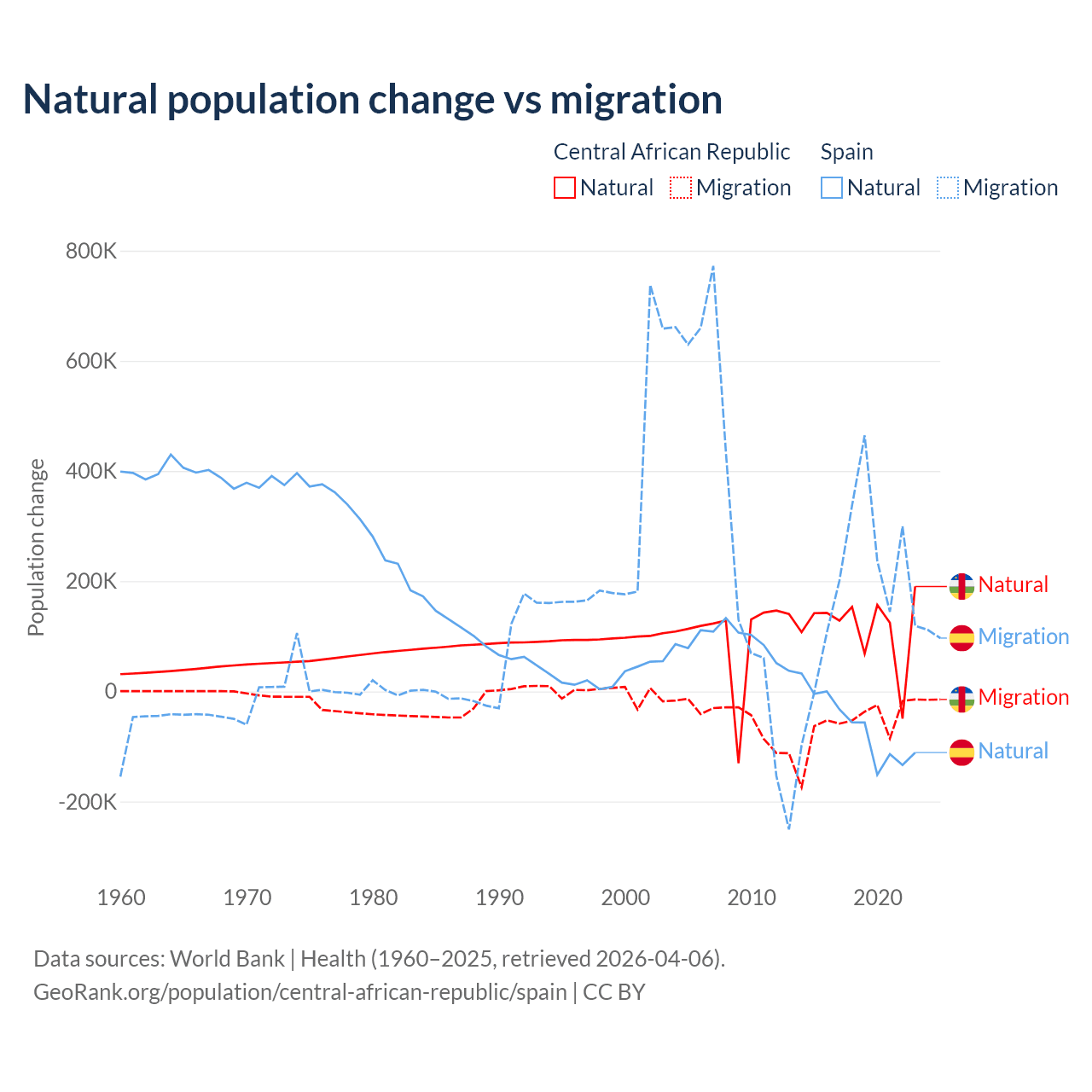 Over the last 10 years, 66.7% of the population change in the Central African Republic is from natural causes (a gain of 1,164,312 people) and 33.3% is from migration (a loss of 580,593 people). In Spain 25.8% is from natural causes (a loss of 627,829 people) and 74.2% is from migration (a gain of 1,810,127 people).