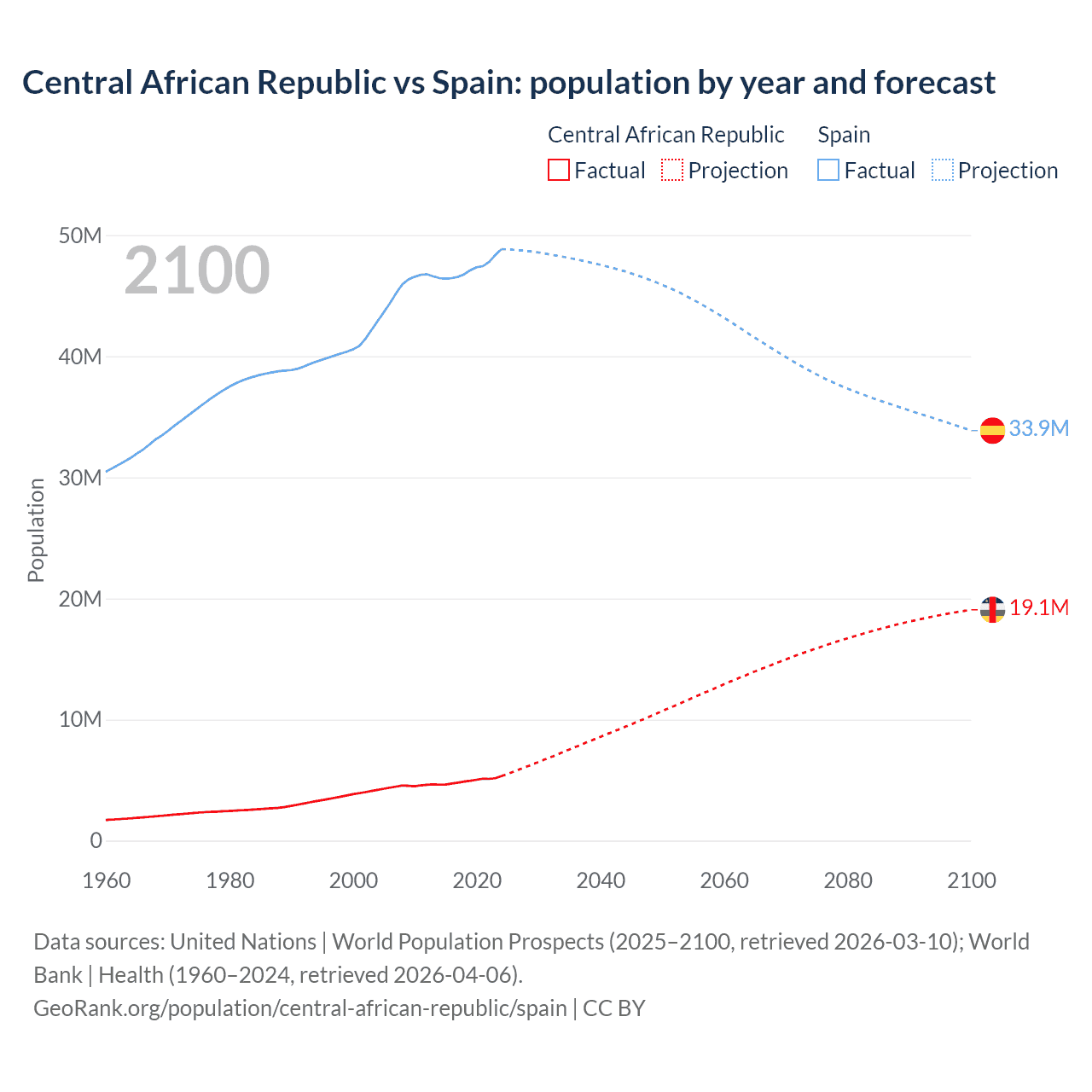 The latest officially reported population of the Central African Republic was 5,330,690 in 2024 vs 48,848,840 people in Spain in 2024. In 2026, based on the adjusted UN estimation, the current Central African Republic's population is 5,753,659 people compared to 48,806,901 in Spain.