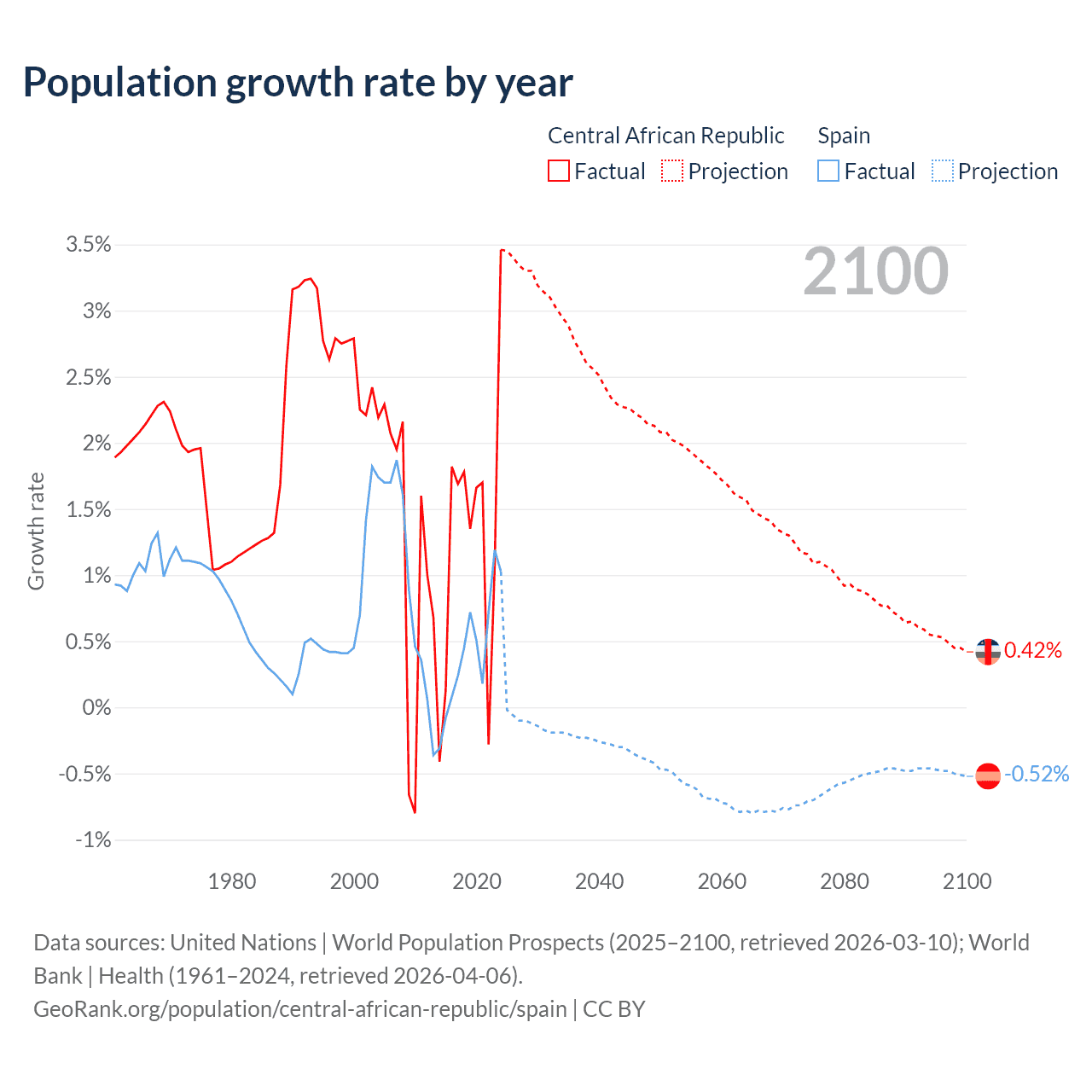- For the last 10 years, the Central African Republic has had an average growth rate of +1.27% per year vs +0.43% in Spain.