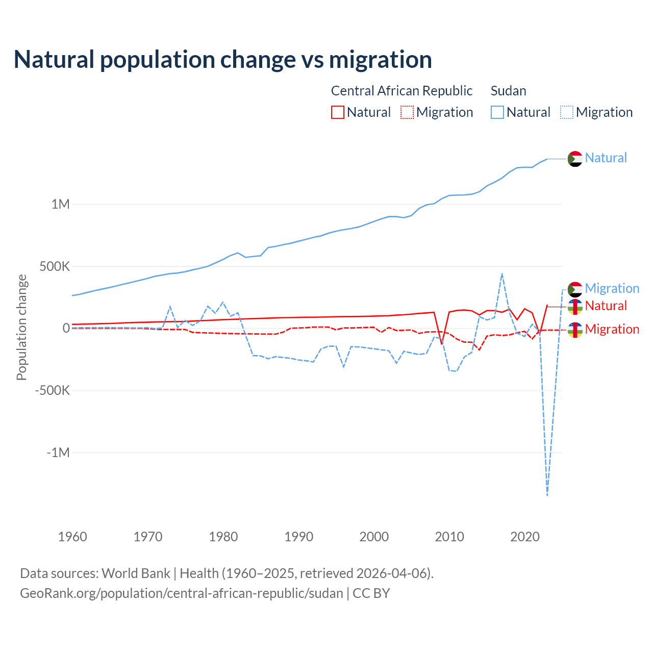 Over the last 10 years, 66.7% of the population change in the Central African Republic is from natural causes (a gain of 1,164,312 people) and 33.3% is from migration (a loss of 580,593 people). In Sudan 95.1% is from natural causes (a gain of 12,459,977 people) and 4.88% is from migration (a loss of 639,596 people).
