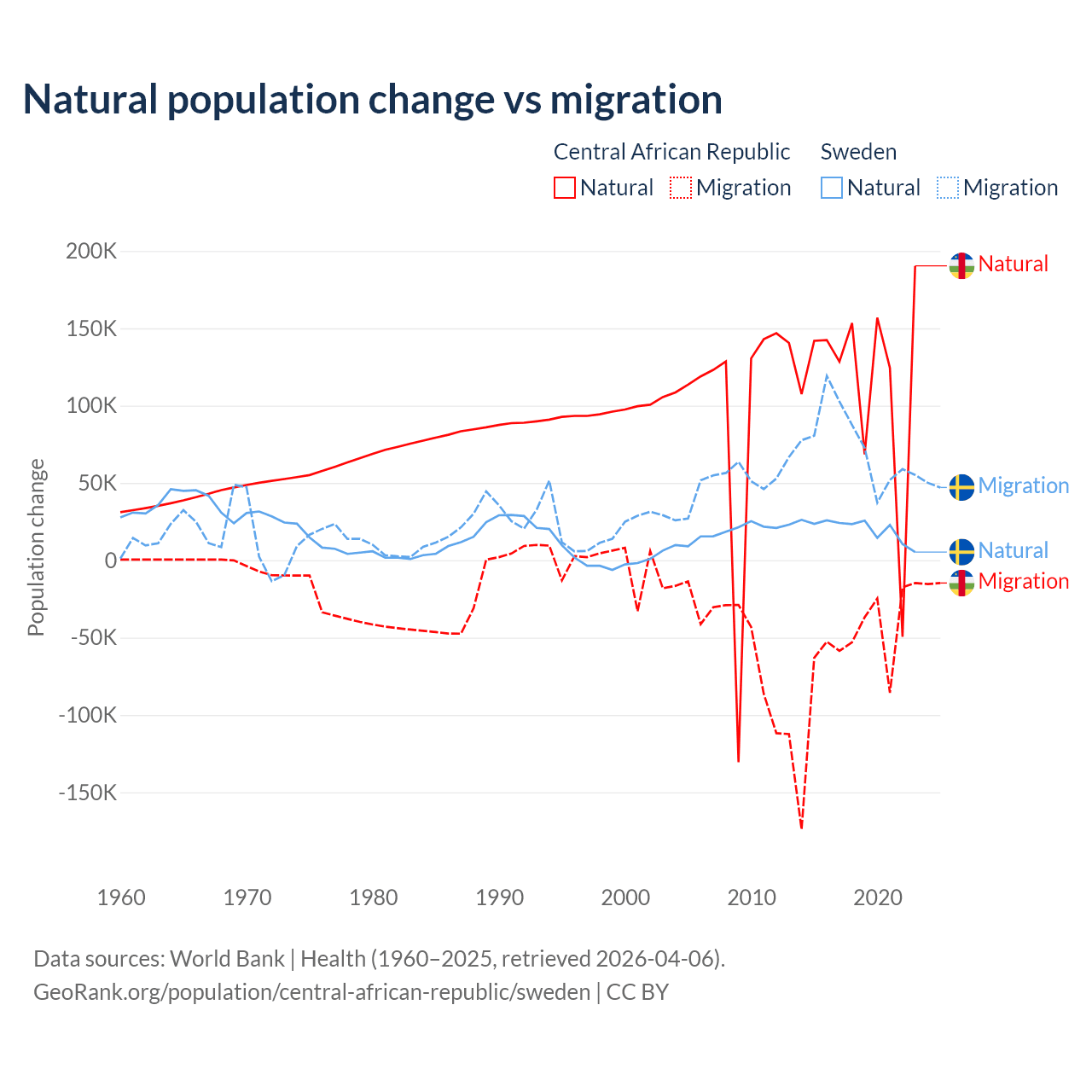 Over the last 10 years, 66.7% of the population change in the Central African Republic is from natural causes (a gain of 1,164,312 people) and 33.3% is from migration (a loss of 580,593 people). In Sweden 21.4% is from natural causes (a gain of 201,900 people) and 78.6% is from migration (a gain of 743,642 people).