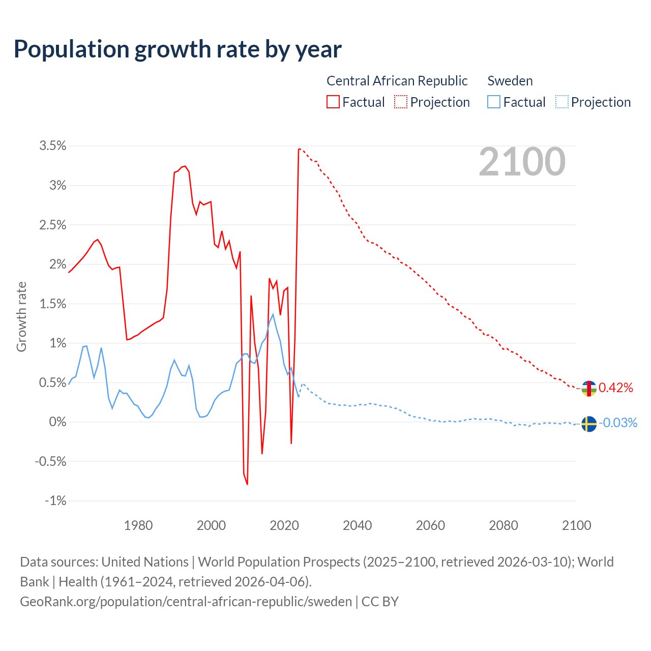 - For the last 10 years, the Central African Republic has had an average growth rate of +1.27% per year vs +0.88% in Sweden.