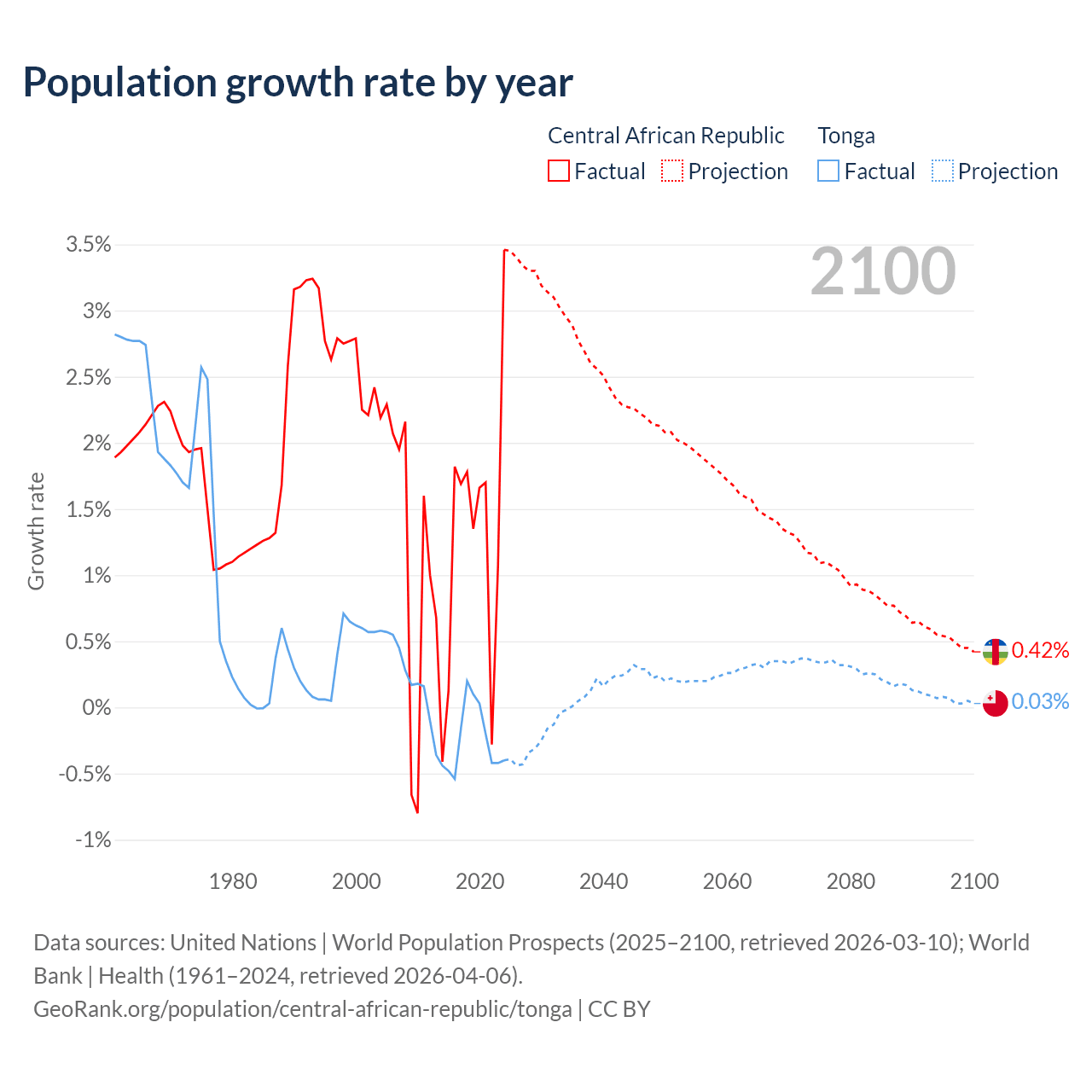 Central African Republic vs Tonga: population by year and forecast