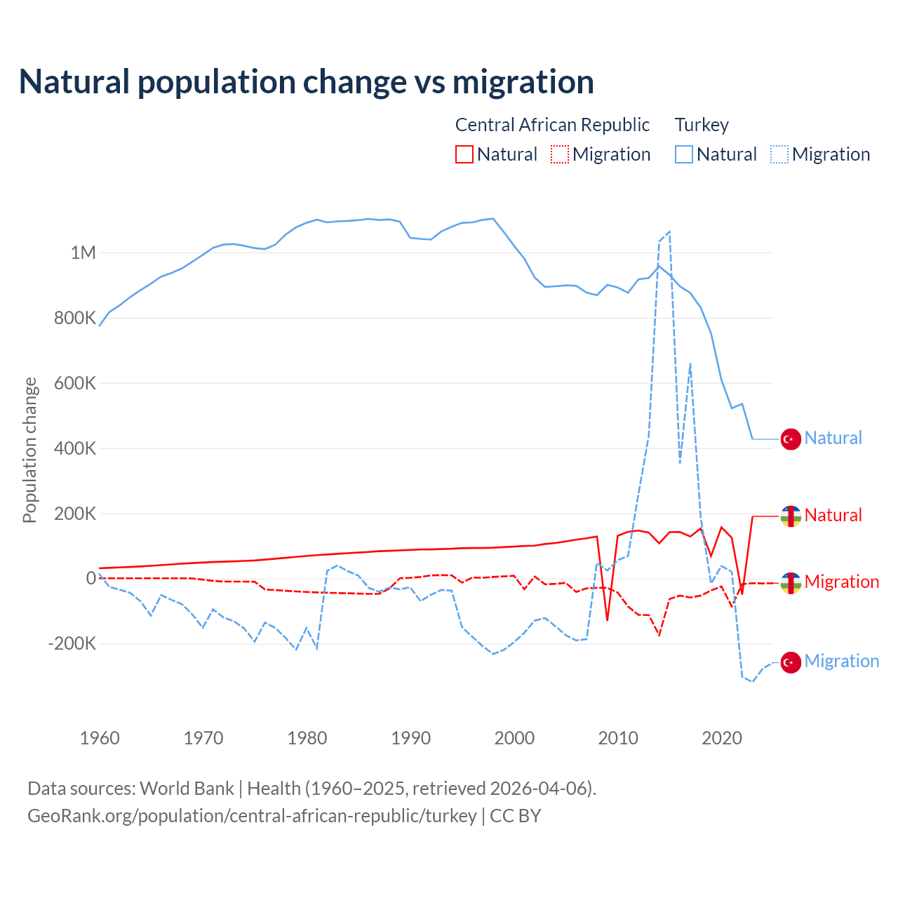 Over the last 10 years, 66.7% of the population change in the Central African Republic is from natural causes (a gain of 1,164,312 people) and 33.3% is from migration (a loss of 580,593 people). In Turkey 73% is from natural causes (a gain of 7,333,352 people) and 27% is from migration (a gain of 2,718,916 people).