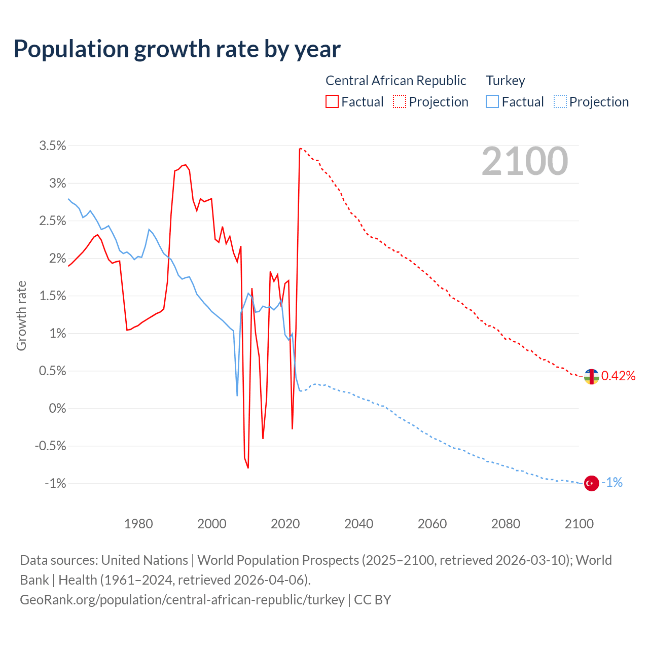 - For the last 10 years, the Central African Republic has had an average growth rate of +1.27% per year vs +1.06% in Turkey.