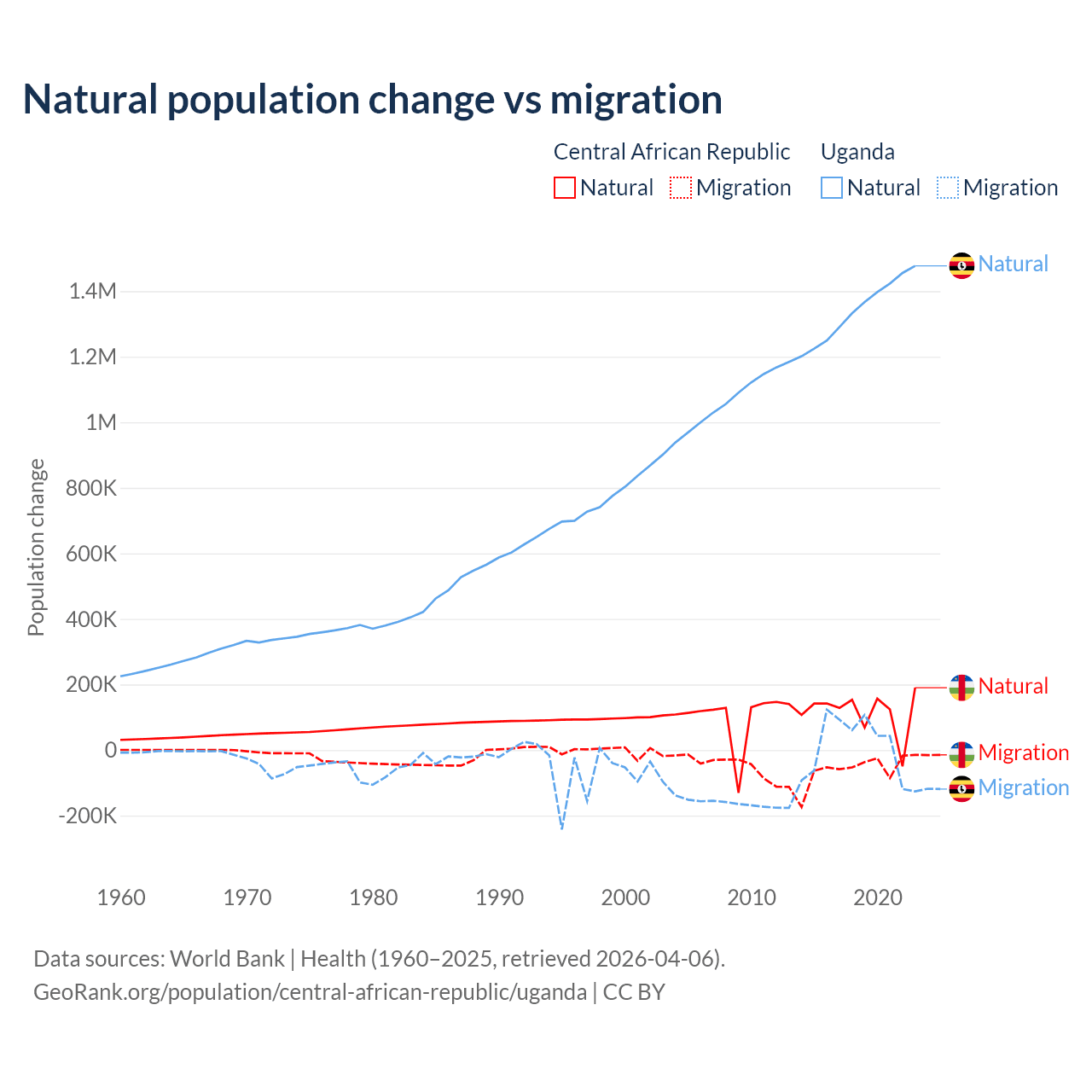 Over the last 10 years, 66.7% of the population change in the Central African Republic is from natural causes (a gain of 1,164,312 people) and 33.3% is from migration (a loss of 580,593 people). In Uganda 99.5% is from natural causes (a gain of 13,419,712 people) and 0.53% is from migration (a gain of 71,457 people).