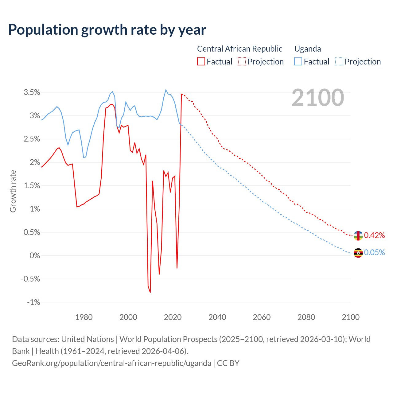 - For the last 10 years, the Central African Republic has had an average growth rate of +1.27% per year vs +3.21% in Uganda.