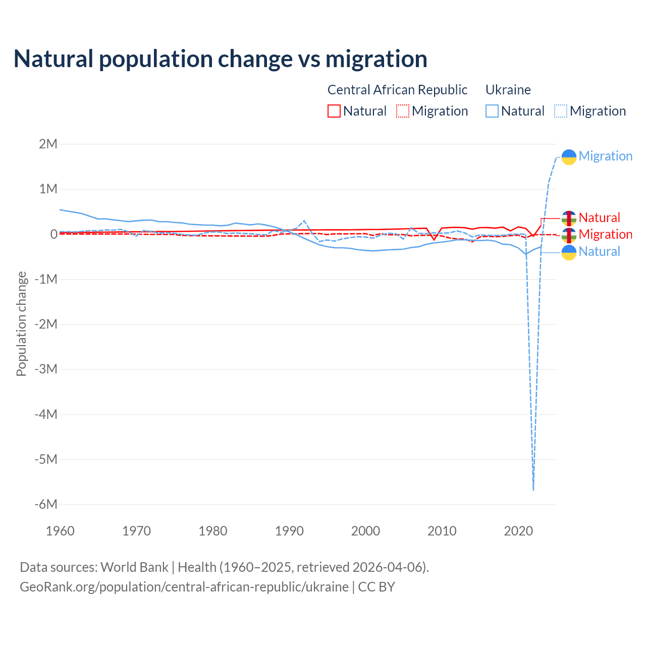 Over the last 10 years, 66.7% of the population change in the Central African Republic is from natural causes (a gain of 1,164,312 people) and 33.3% is from migration (a loss of 580,593 people). In Ukraine 28.2% is from natural causes (a loss of 2,435,153 people) and 71.8% is from migration (a loss of 6,198,995 people).