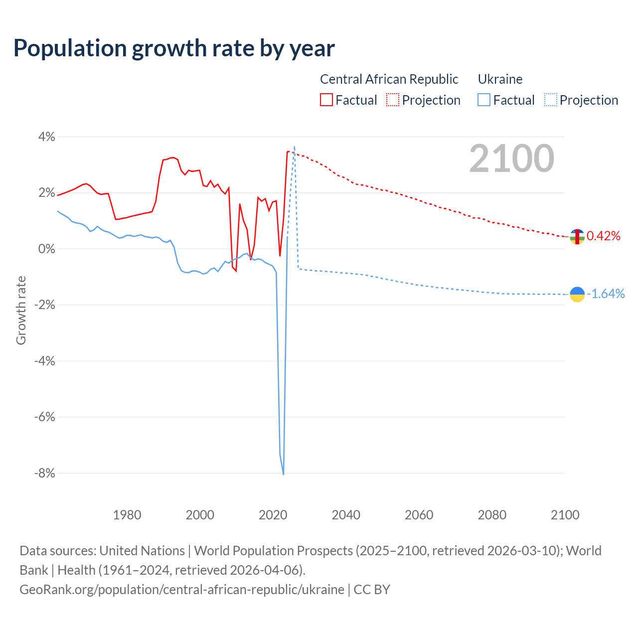 - For the last 10 years, the Central African Republic has had an average growth rate of +1.27% per year vs -1.74% in Ukraine.