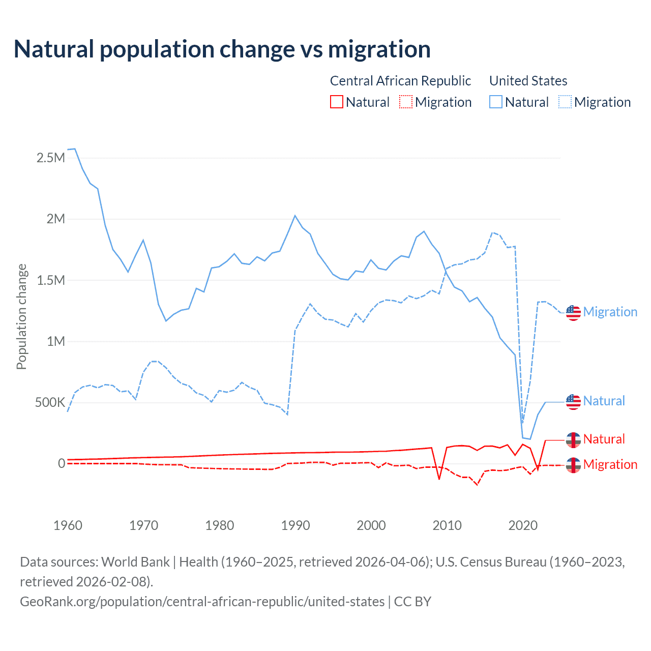 Over the last 10 years, 66.7% of the population change in the Central African Republic is from natural causes (a gain of 1,164,312 people) and 33.3% is from migration (a loss of 580,593 people). In the United States 35.8% is from natural causes (a gain of 8,005,866 people) and 64.2% is from migration (a gain of 14,334,286 people).