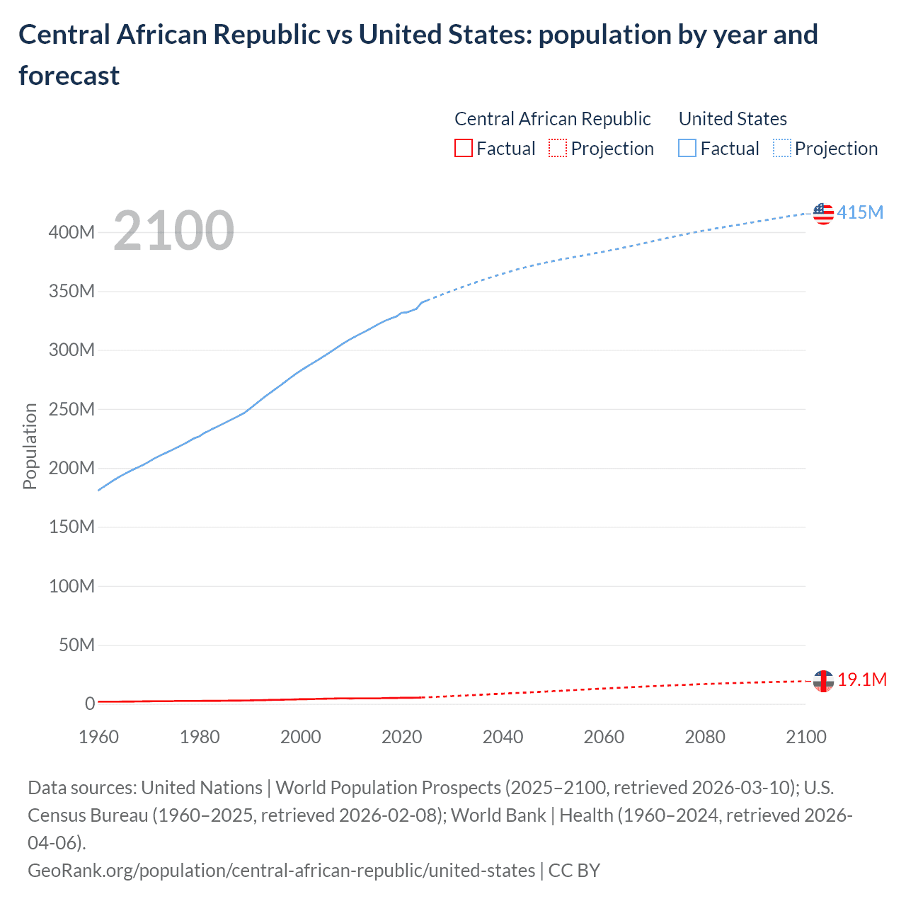 - The United States' population is 59.8 times bigger than the Central African Republic's.
