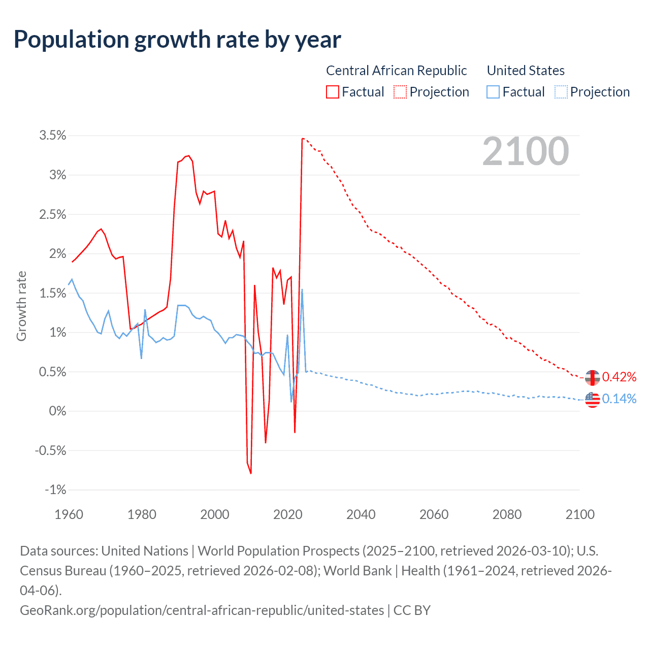 - For the last 10 years, the Central African Republic has had an average growth rate of +1.27% per year vs +0.65% in the United States.