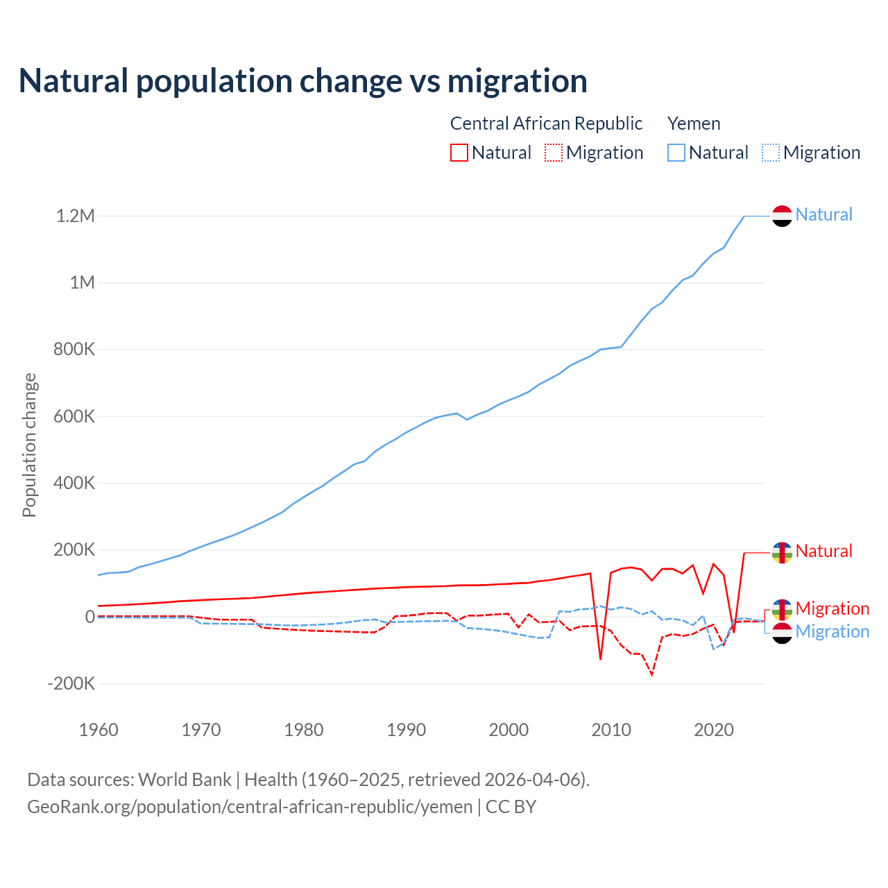 Over the last 10 years, 66.7% of the population change in the Central African Republic is from natural causes (a gain of 1,164,312 people) and 33.3% is from migration (a loss of 580,593 people). In Yemen 97.8% is from natural causes (a gain of 10,460,813 people) and 2.17% is from migration (a loss of 231,814 people).