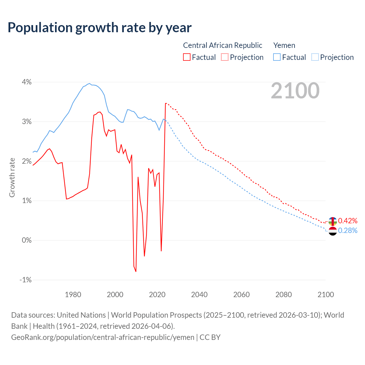 - For the last 10 years, the Central African Republic has had an average growth rate of +1.27% per year vs +3% in Yemen.