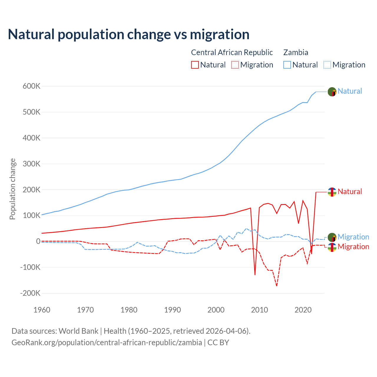 Over the last 10 years, 66.7% of the population change in the Central African Republic is from natural causes (a gain of 1,164,312 people) and 33.3% is from migration (a loss of 580,593 people). In Zambia 97.4% is from natural causes (a gain of 5,233,797 people) and 2.58% is from migration (a gain of 138,554 people).