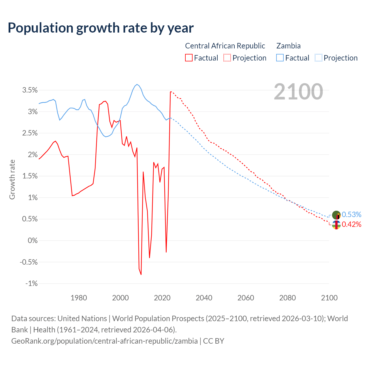 - For the last 10 years, the Central African Republic has had an average growth rate of +1.27% per year vs +3% in Zambia.