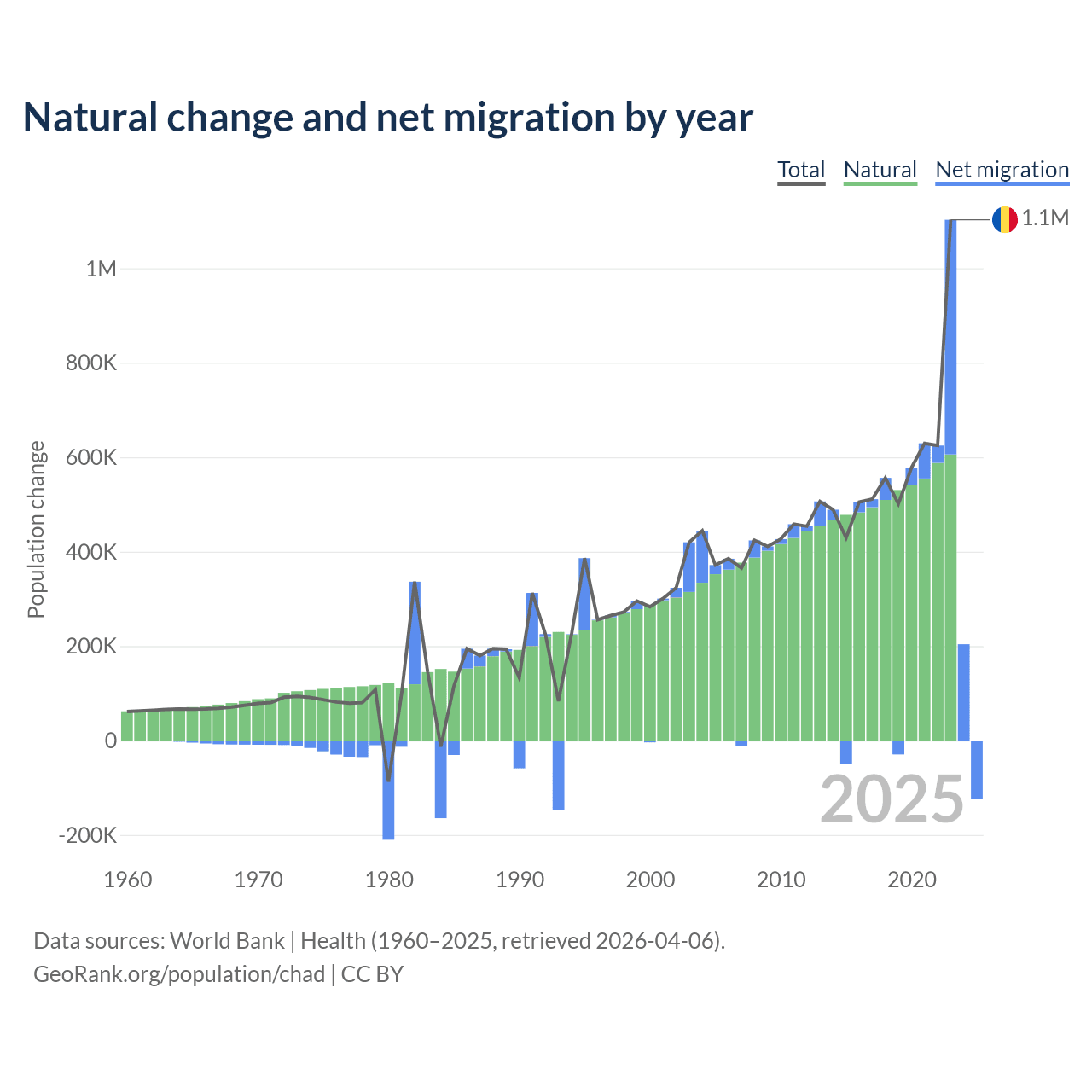 Over the last 10 years, 88.7% of the population change in Chad is from natural causes (a gain of 5,253,964 people) and 11.3% is from migration (a gain of 672,204 people).