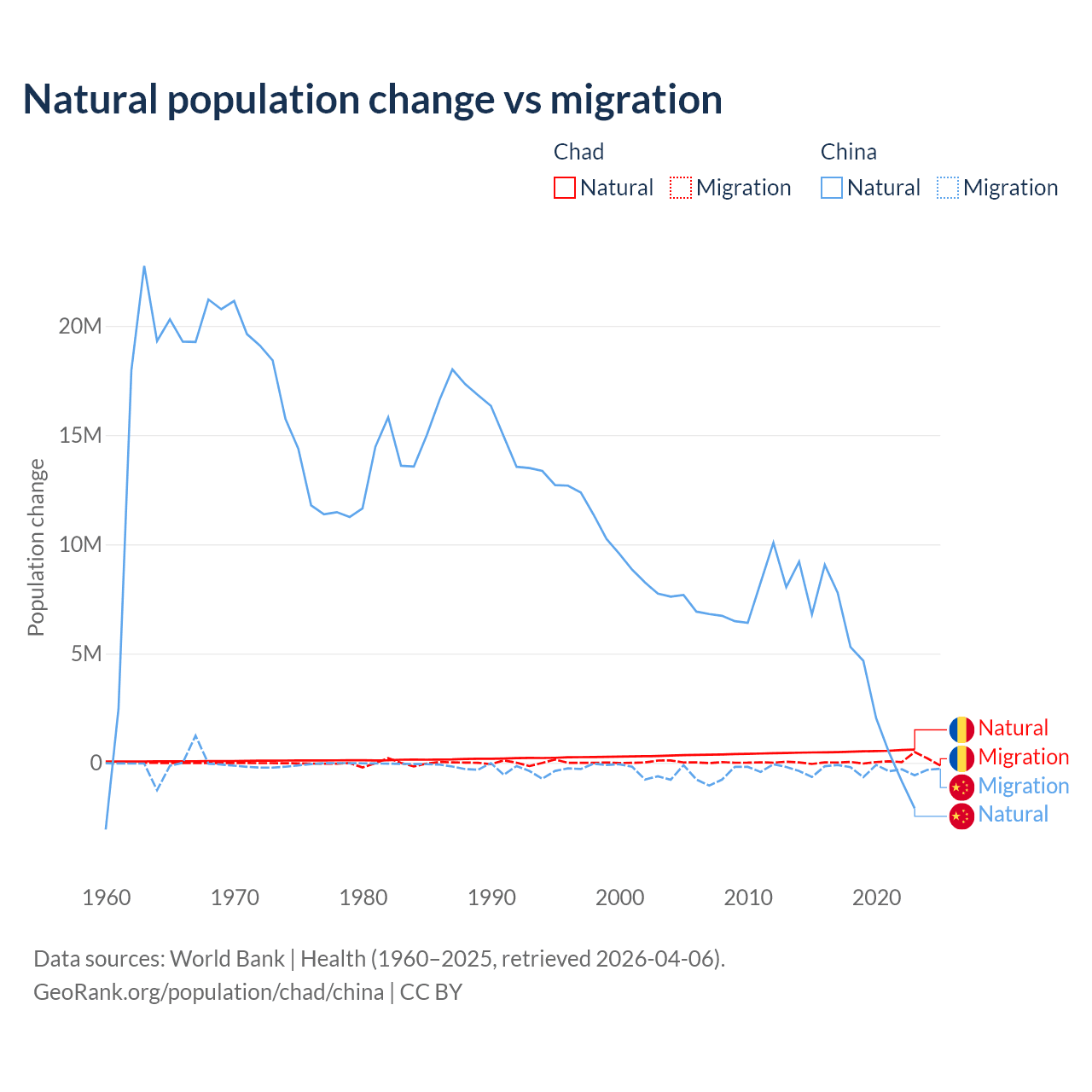 Over the last 10 years, 88.7% of the population change in Chad is from natural causes (a gain of 5,253,964 people) and 11.3% is from migration (a gain of 672,204 people). In China 92.5% is from natural causes (a gain of 42,414,528 people) and 7.53% is from migration (a loss of 3,452,923 people).