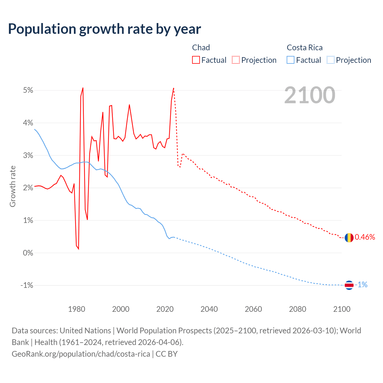 - For the last 10 years, Chad has had an average growth rate of +3.65% per year vs +0.77% in Costa Rica.