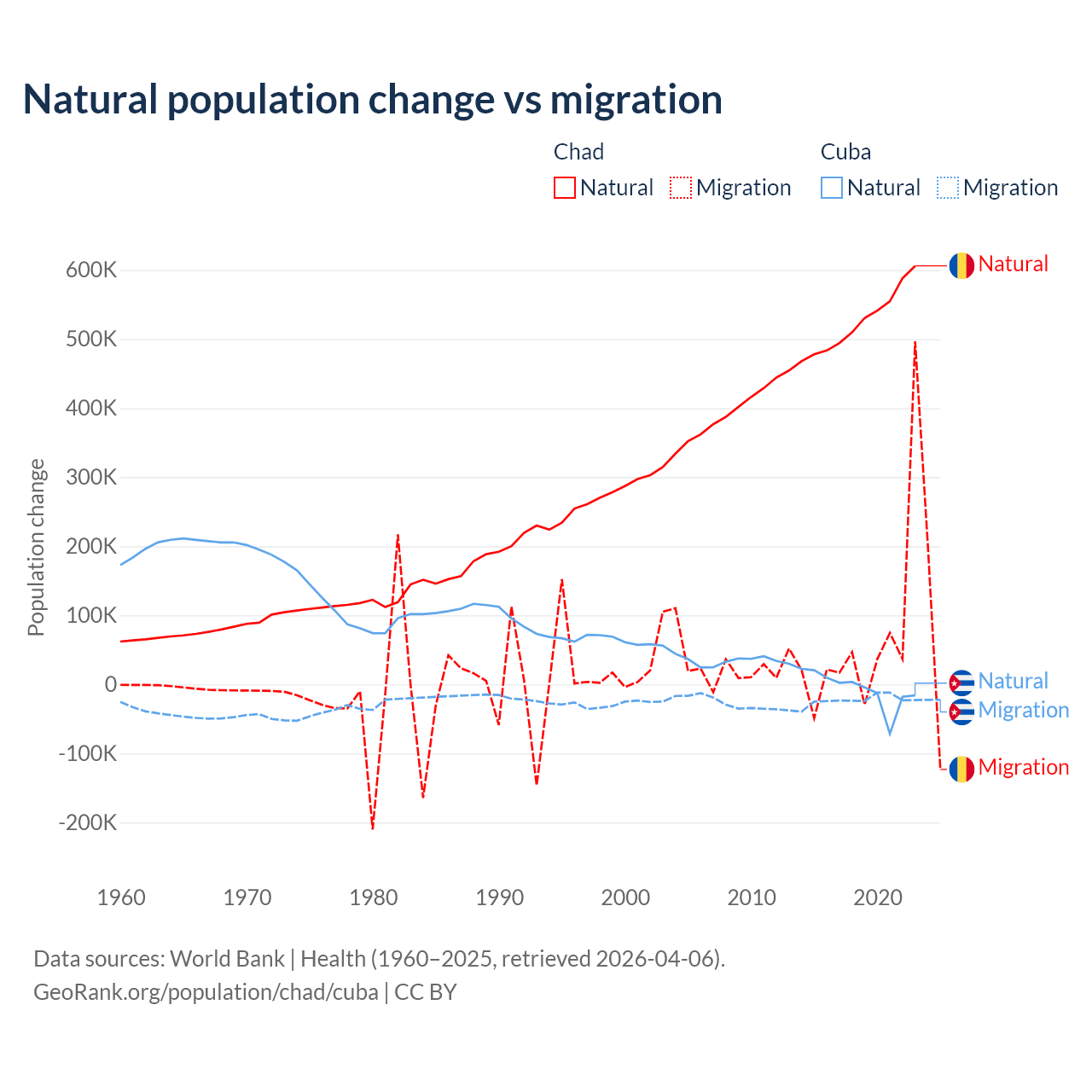 Over the last 10 years, 88.7% of the population change in Chad is from natural causes (a gain of 5,253,964 people) and 11.3% is from migration (a gain of 672,204 people). In Cuba 21.9% is from natural causes (a loss of 64,179 people) and 78.1% is from migration (a loss of 229,508 people).