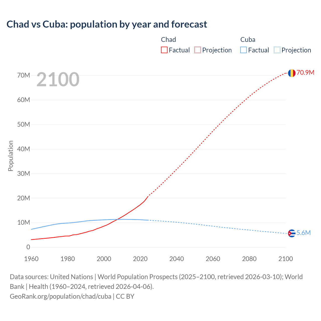 - Since 2006, the population of Chad has increased from 10.7M people to 21.9M (104.5% growth), while Cuba has declined from 11.3M to 10.9M (3.4% decline).