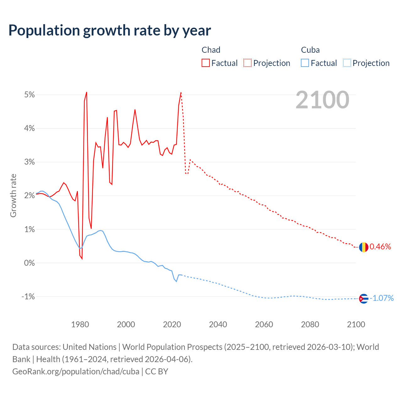 - For the last 10 years, Chad has had an average growth rate of +3.65% per year vs -0.26% in Cuba.