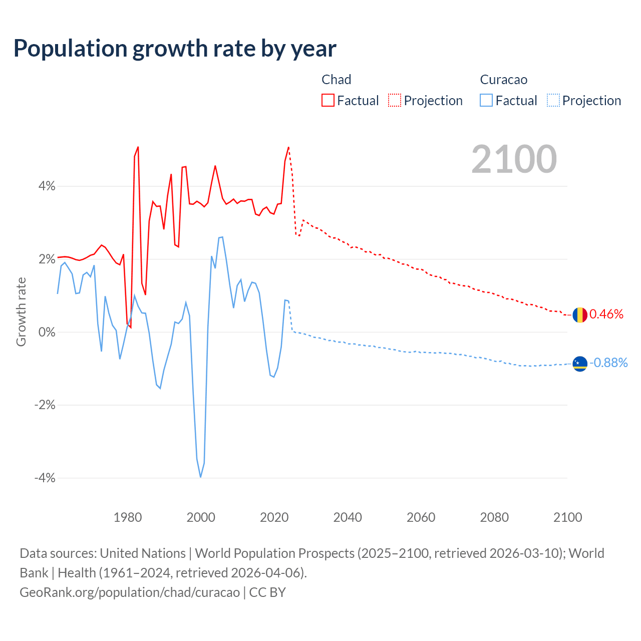 - For the last 10 years, Chad has had an average growth rate of +3.65% per year vs +0.13% in Curacao.