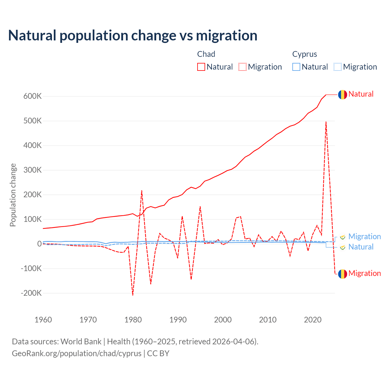 Over the last 10 years, 88.7% of the population change in Chad is from natural causes (a gain of 5,253,964 people) and 11.3% is from migration (a gain of 672,204 people). In Cyprus 36.2% is from natural causes (a gain of 57,464 people) and 63.8% is from migration (a gain of 101,458 people).