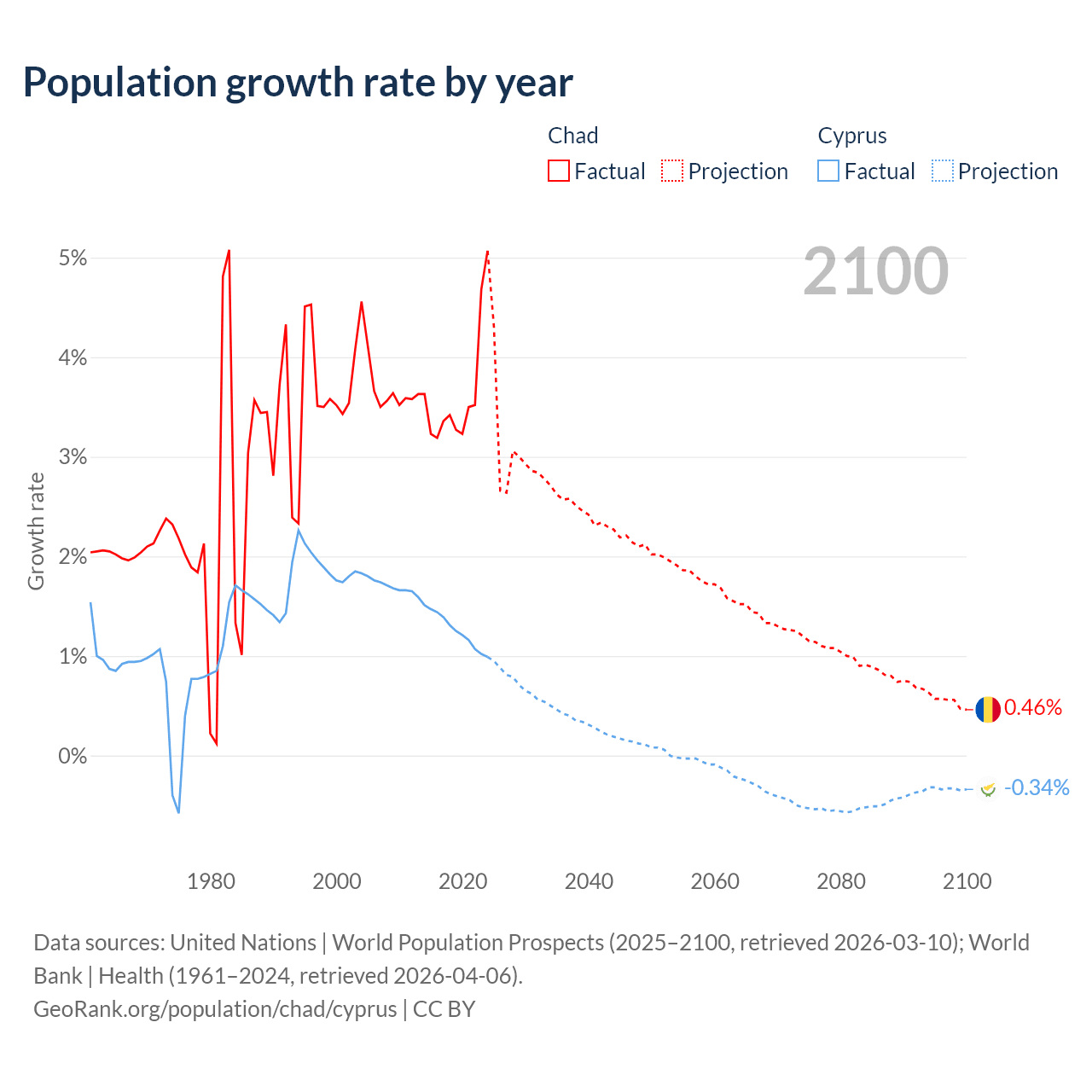 - For the last 10 years, Chad has had an average growth rate of +3.65% per year vs +1.26% in Cyprus.