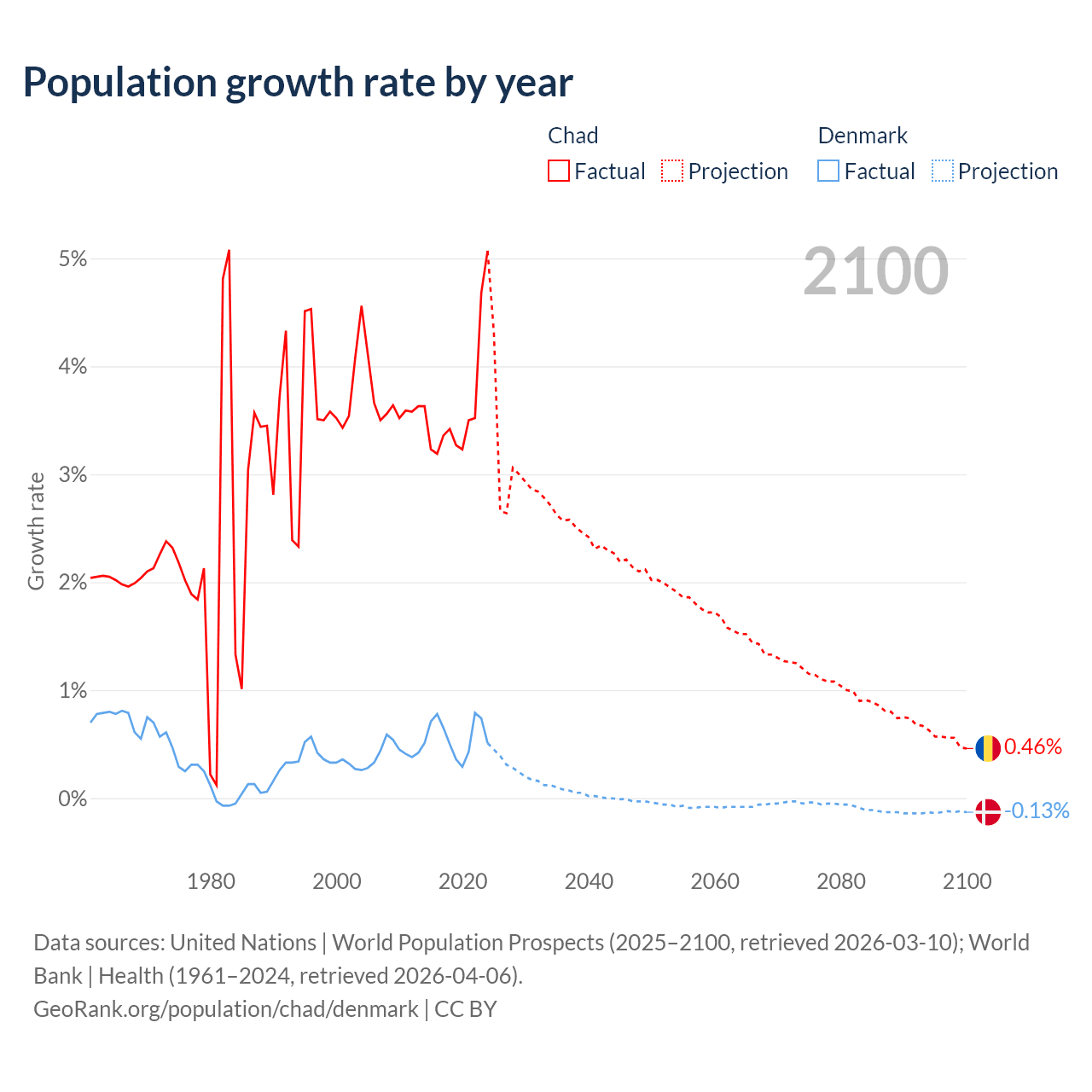 - For the last 10 years, Chad has had an average growth rate of +3.65% per year vs +0.57% in Denmark.