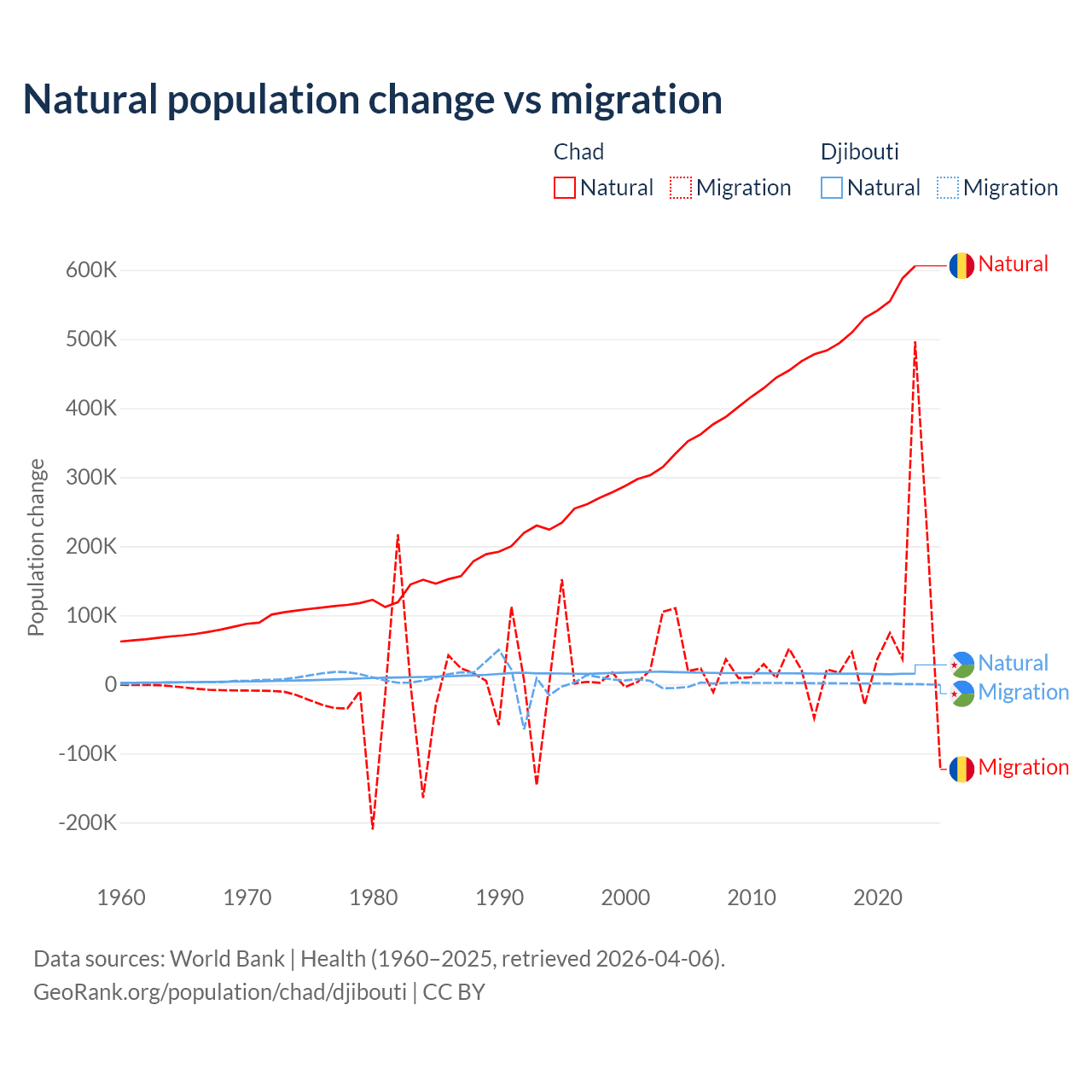 Over the last 10 years, 88.7% of the population change in Chad is from natural causes (a gain of 5,253,964 people) and 11.3% is from migration (a gain of 672,204 people). In Djibouti 92.1% is from natural causes (a gain of 153,892 people) and 7.87% is from migration (a gain of 13,138 people).
