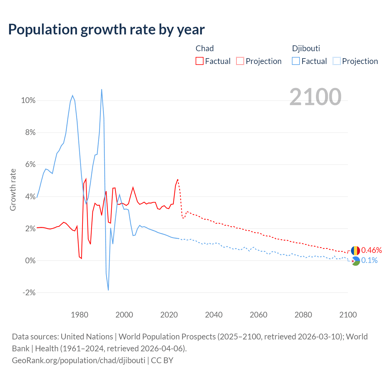 - For the last 10 years, Chad has had an average growth rate of +3.65% per year vs +1.57% in Djibouti.
