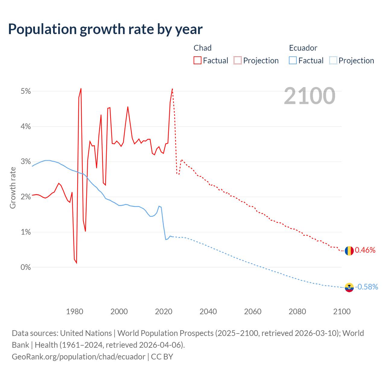 - For the last 10 years, Chad has had an average growth rate of +3.65% per year vs +1.26% in Ecuador.