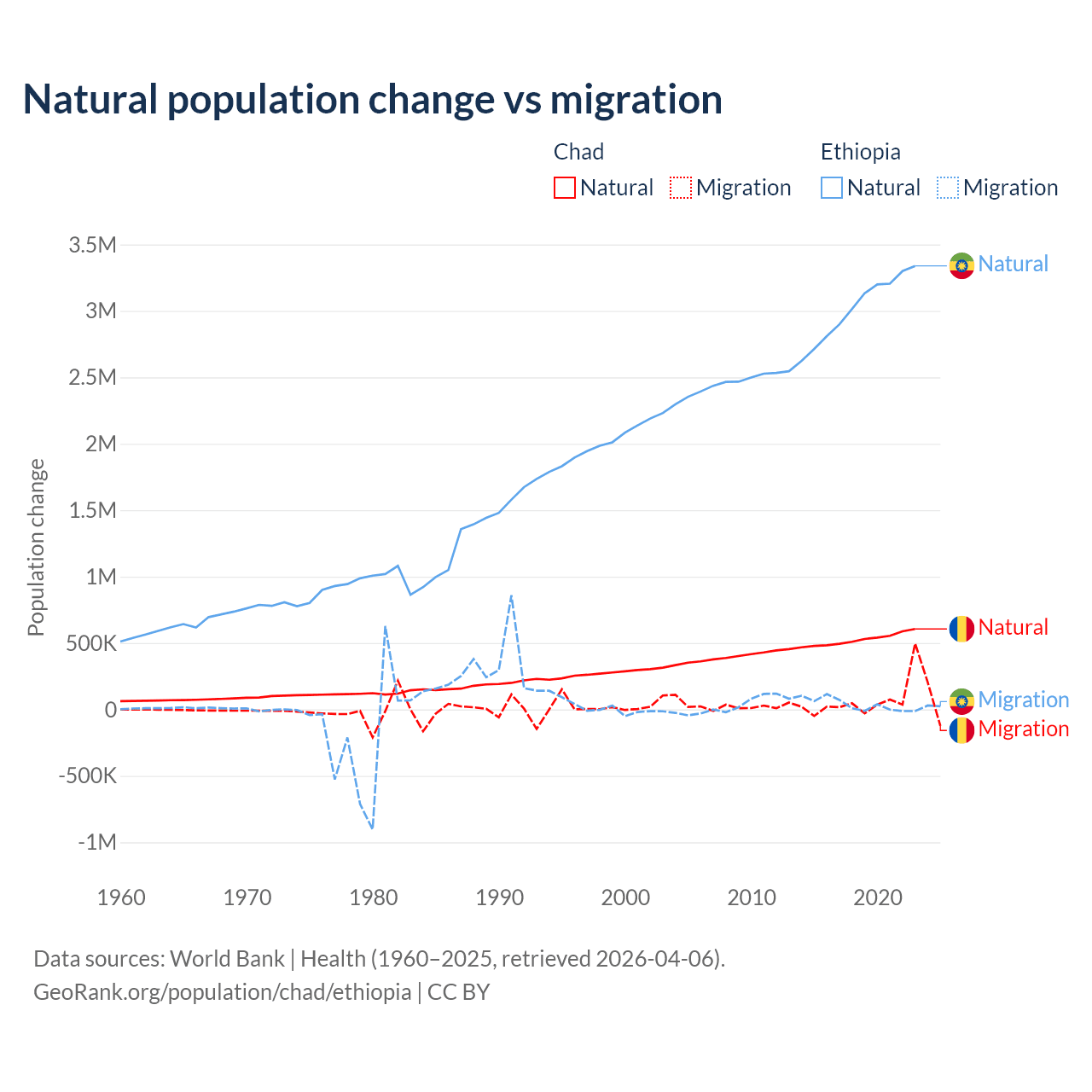 Over the last 10 years, 88.7% of the population change in Chad is from natural causes (a gain of 5,253,964 people) and 11.3% is from migration (a gain of 672,204 people). In Ethiopia 98.8% is from natural causes (a gain of 30,237,373 people) and 1.19% is from migration (a gain of 365,488 people).