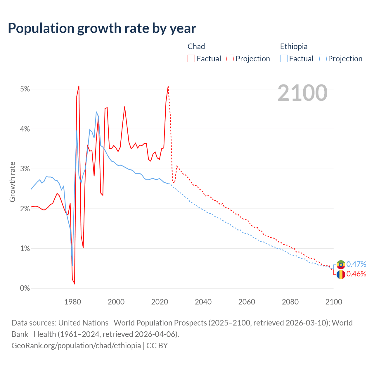 - For the last 10 years, Chad has had an average growth rate of +3.65% per year vs +2.71% in Ethiopia.