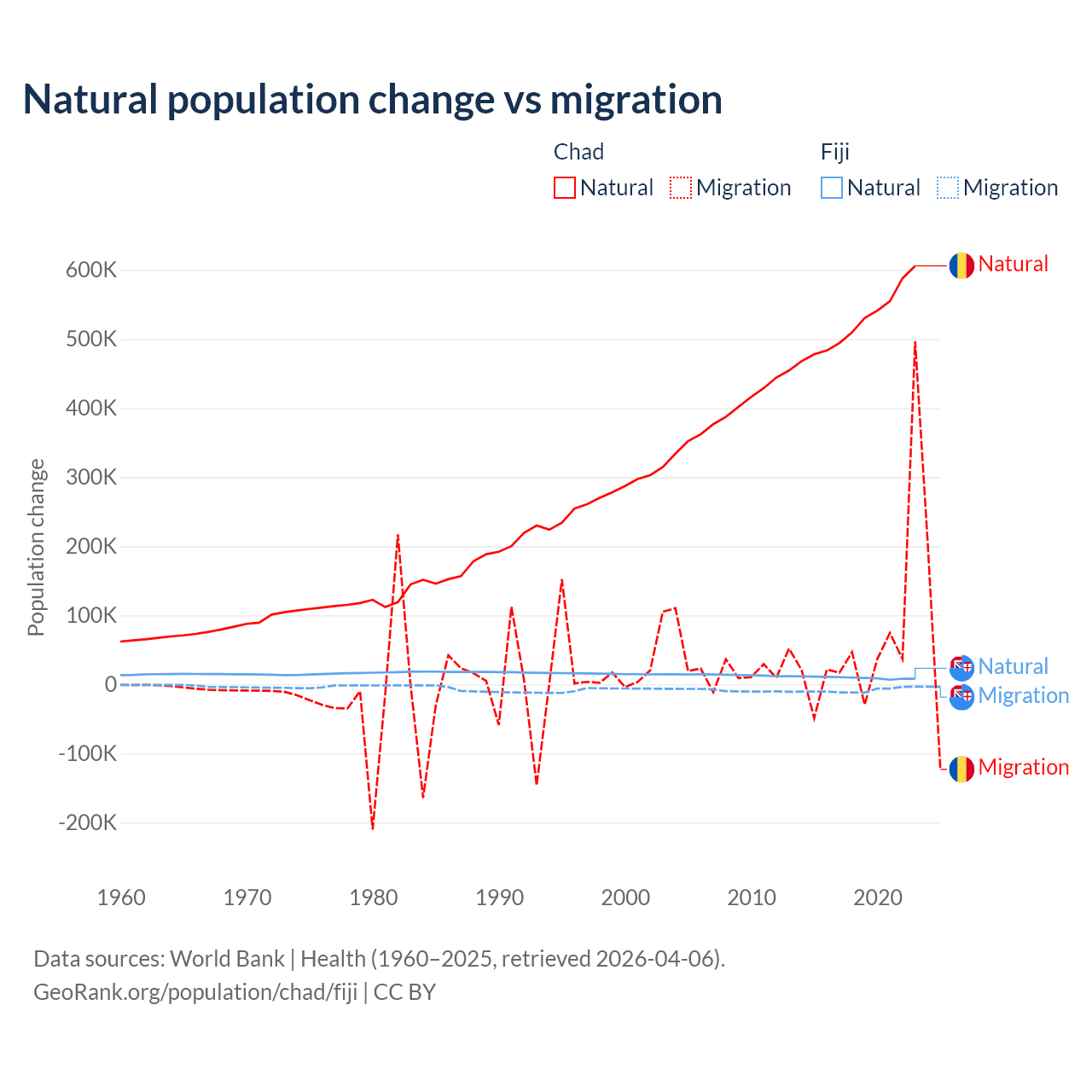 Over the last 10 years, 88.7% of the population change in Chad is from natural causes (a gain of 5,253,964 people) and 11.3% is from migration (a gain of 672,204 people). In Fiji 52.6% is from natural causes (a gain of 94,971 people) and 47.4% is from migration (a loss of 85,415 people).
