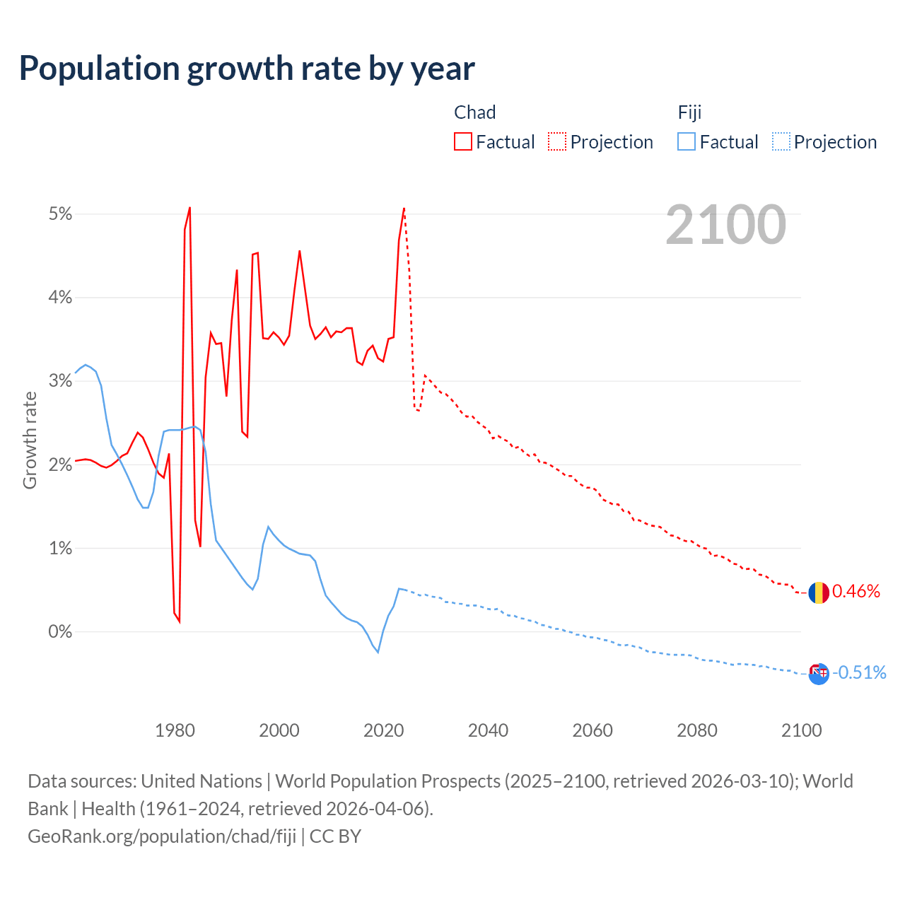 - For the last 10 years, Chad has had an average growth rate of +3.65% per year vs +0.12% in Fiji.