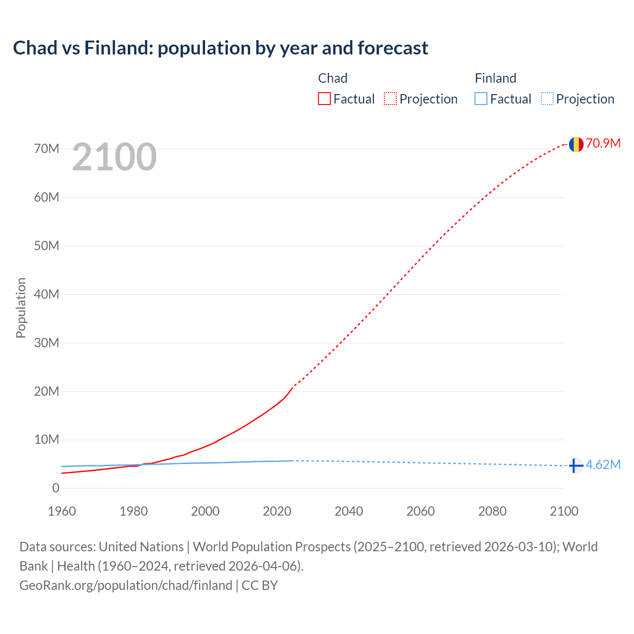 The latest officially reported population of Chad was 20,299,123 in 2024 vs 5,619,911 people in Finland in 2024. In 2026, based on the adjusted UN estimation, the current Chad's population is 21,893,857 people compared to 5,631,965 in Finland.