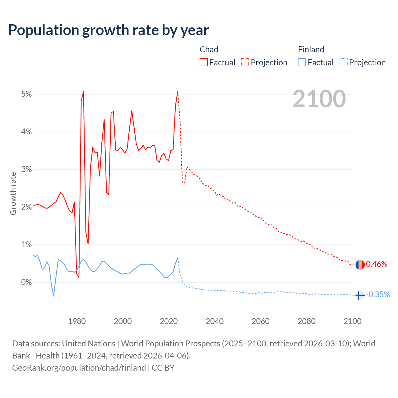 - For the last 10 years, Chad has had an average growth rate of +3.65% per year vs +0.3% in Finland.