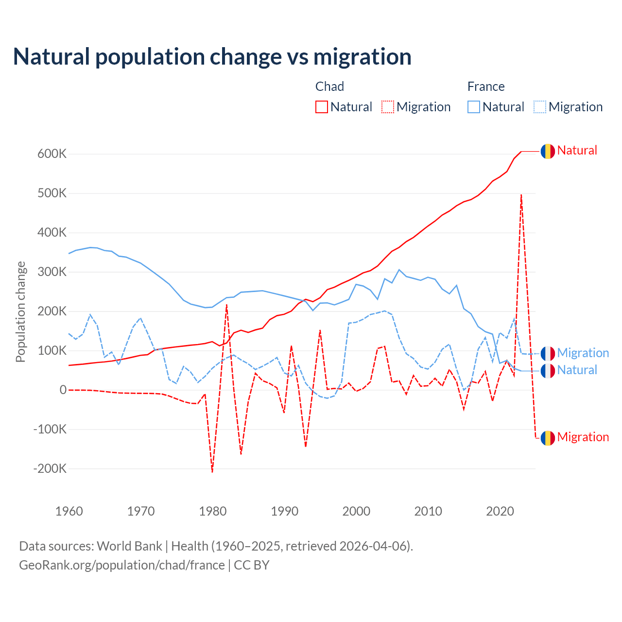 Over the last 10 years, 88.7% of the population change in Chad is from natural causes (a gain of 5,253,964 people) and 11.3% is from migration (a gain of 672,204 people). In France 59.5% is from natural causes (a gain of 1,359,540 people) and 40.5% is from migration (a gain of 923,723 people).