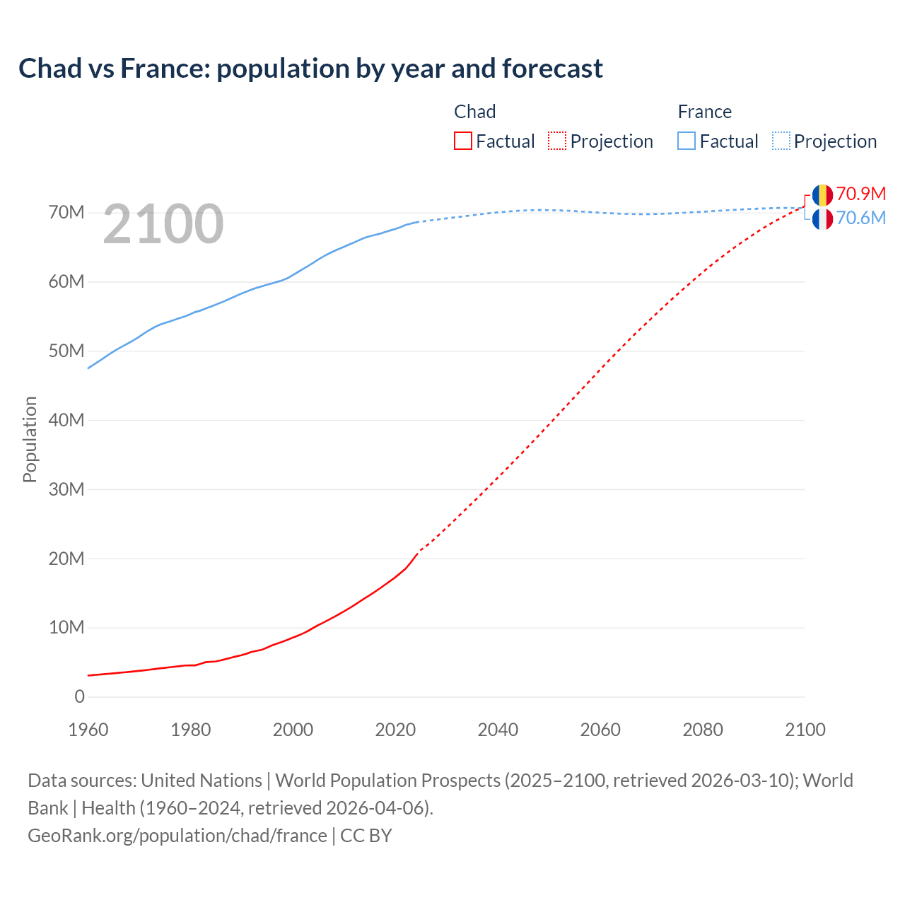 Chad vs France: population by year and forecast