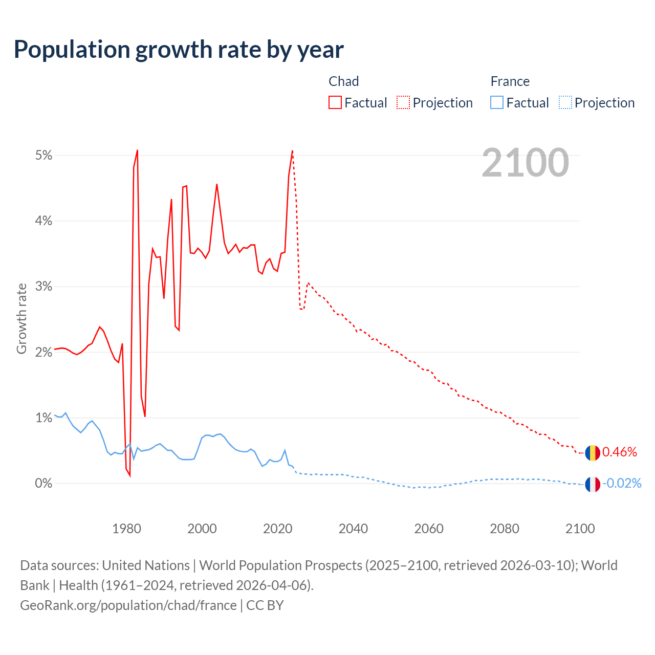 - For the last 10 years, Chad has had an average growth rate of +3.65% per year vs +0.35% in France.