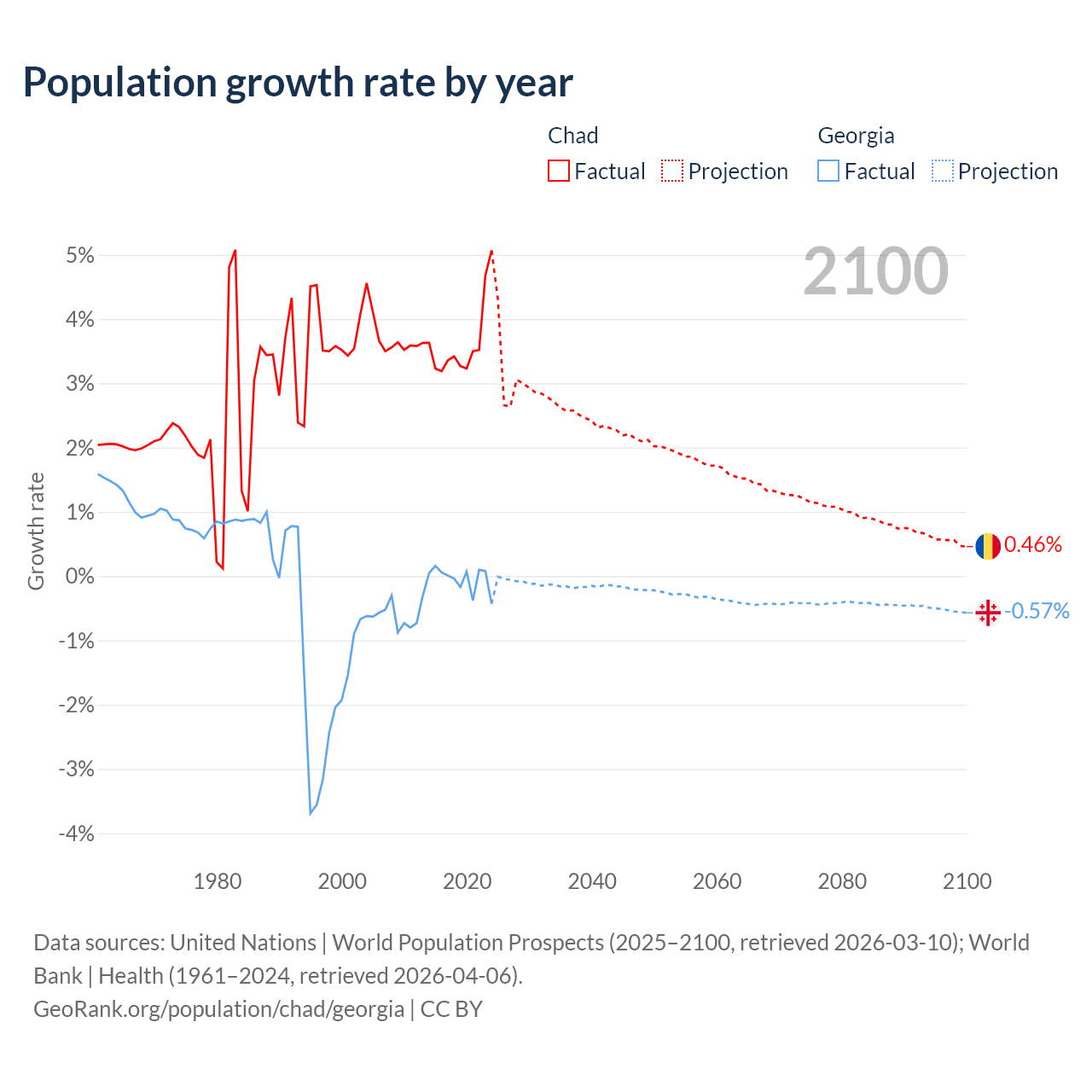 - For the last 10 years, Chad has had an average growth rate of +3.65% per year vs -0.04% in Georgia.