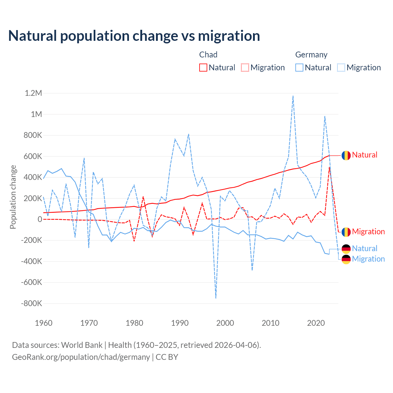 Over the last 10 years, 88.7% of the population change in Chad is from natural causes (a gain of 5,253,964 people) and 11.3% is from migration (a gain of 672,204 people). In Germany 26.8% is from natural causes (a loss of 2,036,130 people) and 73.2% is from migration (a gain of 5,565,916 people).